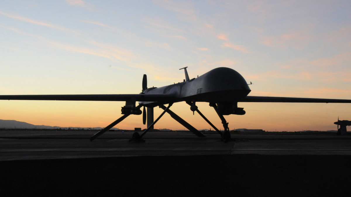 A 163rd Reconnaissance Wing MQ-1 Predator is shown during post flight inspection at dusk from Southern California Logistics Airport in Victorville, California, Jan. 7, 2012. (US Air Force photo)